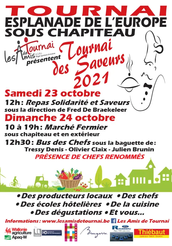 La " Tournai des Saveurs " a débuté l'événement avant les festivités. Du dimanche 14 au vendredi 19 octobre, huit restaurants du Tournaisis nous ont fait l'honneur de participer à notre nouvel événement. Nous leur avions demandé de préparer un plat réalisé uniquement avec des produits du terroir. Il y en avait pour tous les goûts. Nous avons laissé à nos restaurateurs participants le choix du plat et du budget en leur demandant juste de mettre leur plat à un prix raisonnable.